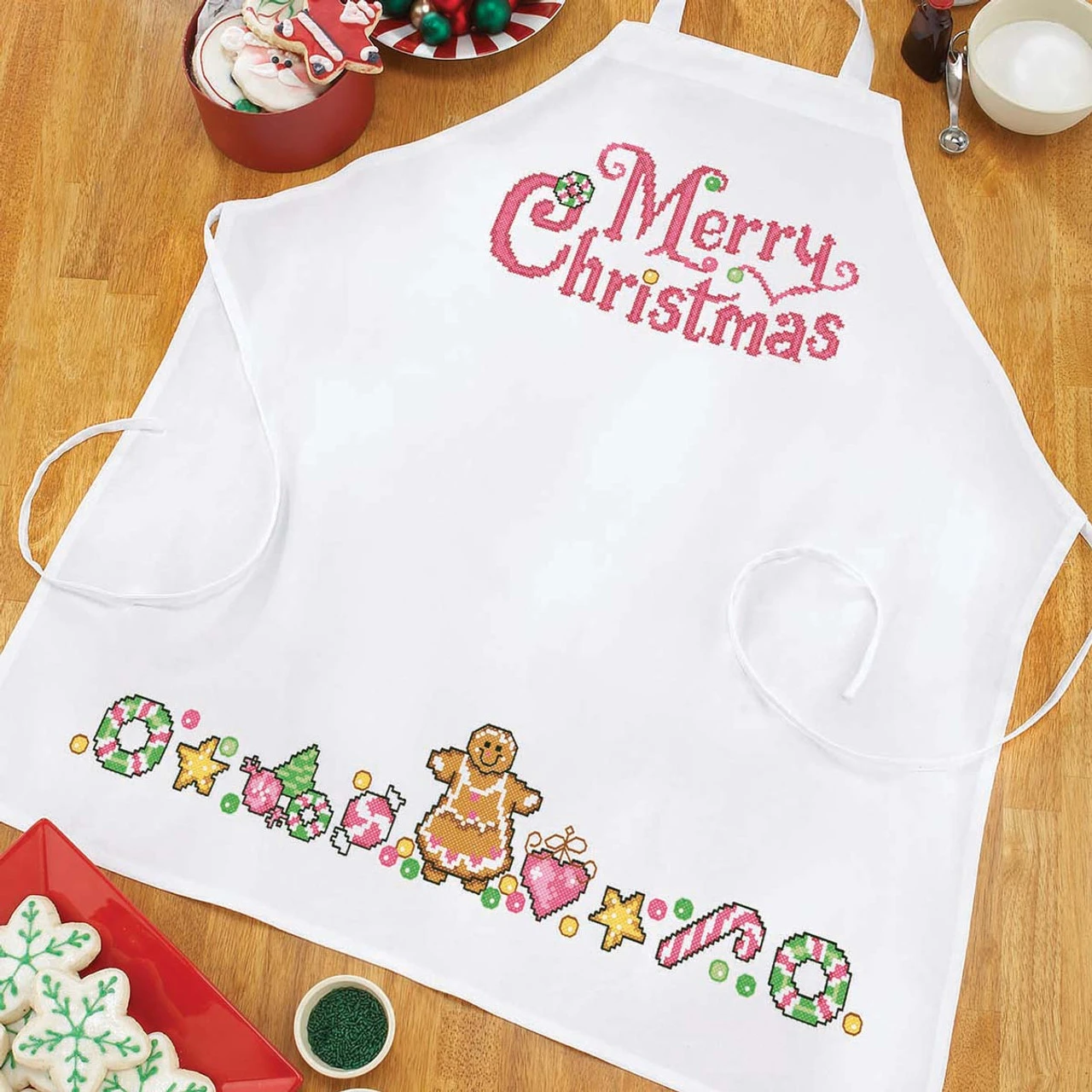 • This pre-finished apron is ready for stitching with the words Merry Christmas and a variety of holiday candies, candy canes, cookies, and a gingerbread woman across the bottom.