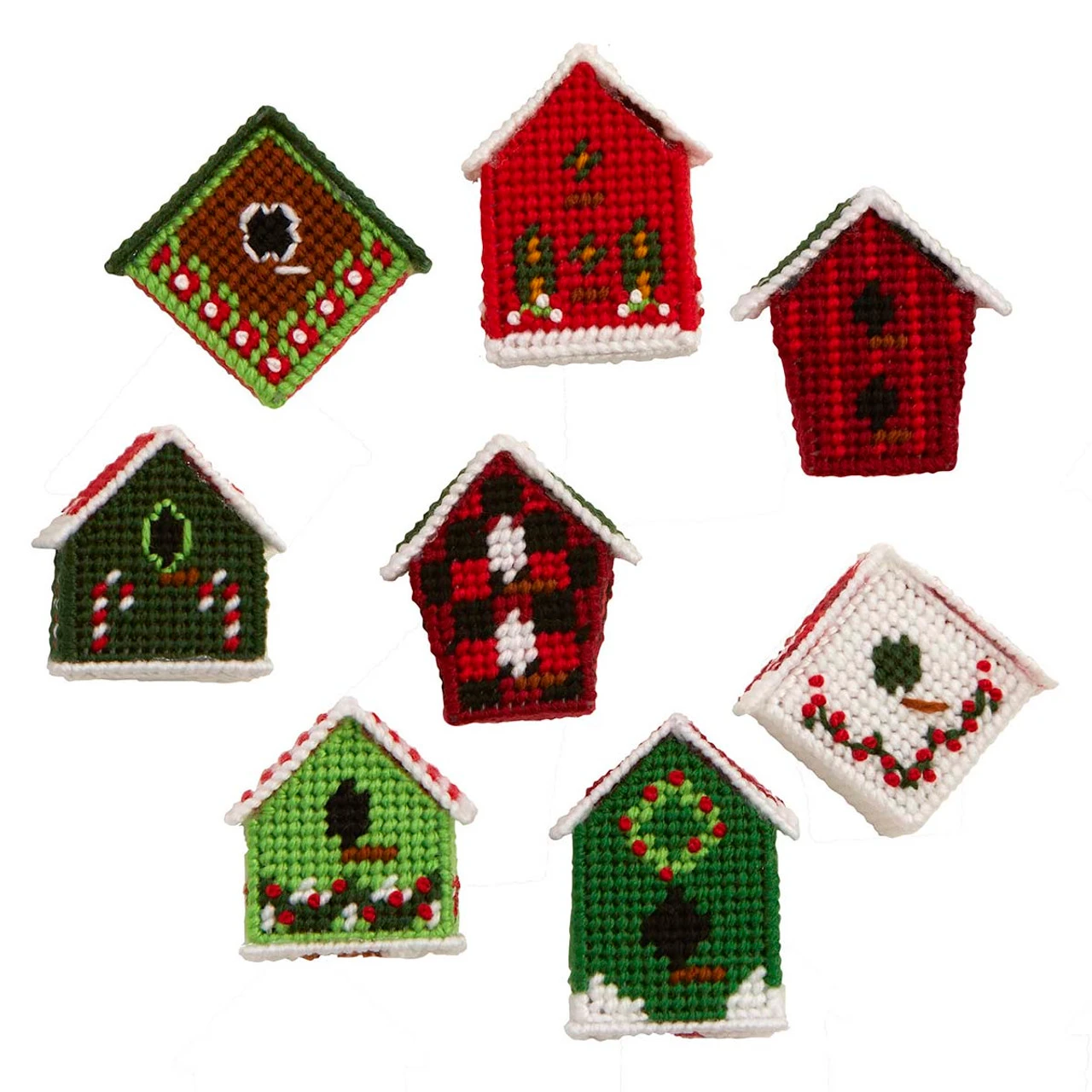 Decorate your Christmas tree with a neighborhood of festive birdhouses. Plastic canvas kit includes 7-mesh plastic canvas, acrylic yarn, and needle. Set of eight. Up to 3½” (8.9cm). Imported.