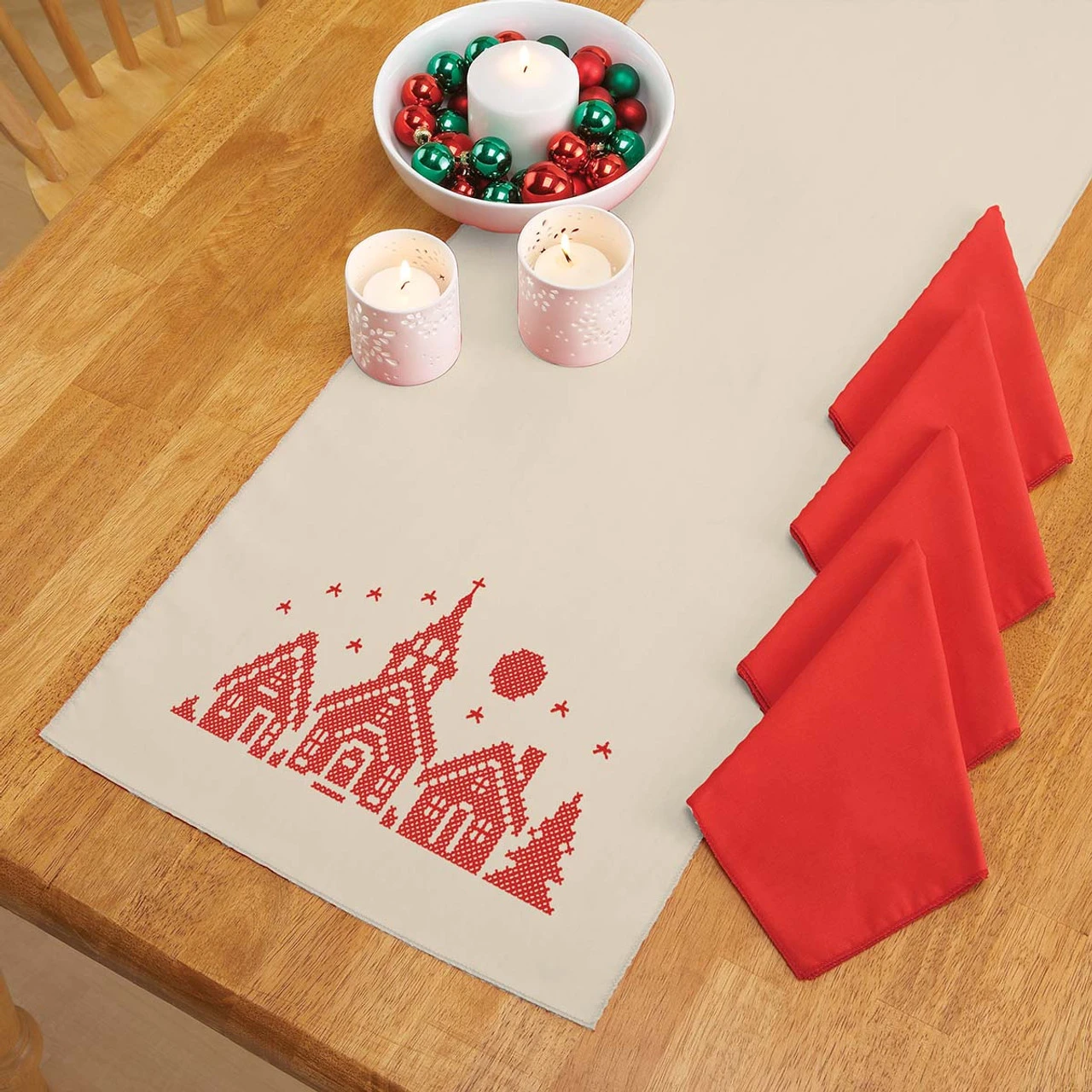 A merry red Christmas village sets a cozy scene at your holiday dinner table. Stamped for cross-stitch on ecru polyester/cotton table runner with a perle edge. 14 × 44″ (36 x 112cm) table runner; 16 × 16″ (41 x 41cm) red napkins. Imported.
