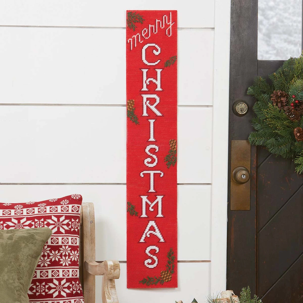 • This plastic canvas porch board features the words Merry Christmas surrounded by pinecones and pine boughs on a bright red background.