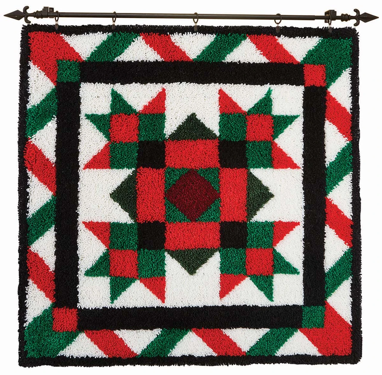 This Christmas latch hook design features a festive holiday quilt block with geometric patterns in shades of red, green, and black with a white background. The finished project can be made into pillows, wall hangings, rugs, and more. Kit includes 3.75-mesh gridded canvas, lofty pre-cut 100% acrylic yarn, clear vinyl storage bag, easy-to-follow chart, and instructions. Also includes decorative hanger to display your finished design. Latch hook tool, rug binding, and non-slip backing not included. The higher-gauge canvas of this project allows for a high level of detail in the finished design. 40 x 40″ (102 x 102cm). Imported.