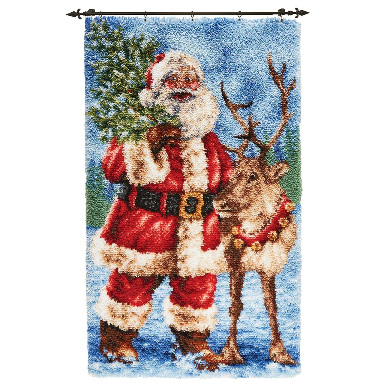 This Christmas latch hook design features a North Pole scene of Santa posing for a Christmas Eve portrait with one of his reindeer team. Santa’s dressed in his iconic red suit as he hoists a small Christmas tree over one shoulder and wraps an arm around a reindeer wearing a red collar with jingle bells on it. The snowy landscape with a background of evergreen trees enhances the wintry appeal of this holiday design. The finished project can be made into pillows, wall hangings, rugs, and more. Kit includes 3.75-mesh gridded canvas, lofty pre-cut 100% acrylic yarn, clear vinyl storage bag, easy-to-follow chart, and instructions. Also includes decorative hanger to display your finished design. Latch hook tool, rug binding, and non-slip backing not included. The higher-gauge canvas of this project allows for a high level of detail in the finished design. 30 x 50″ (76 x 127cm). Imported.