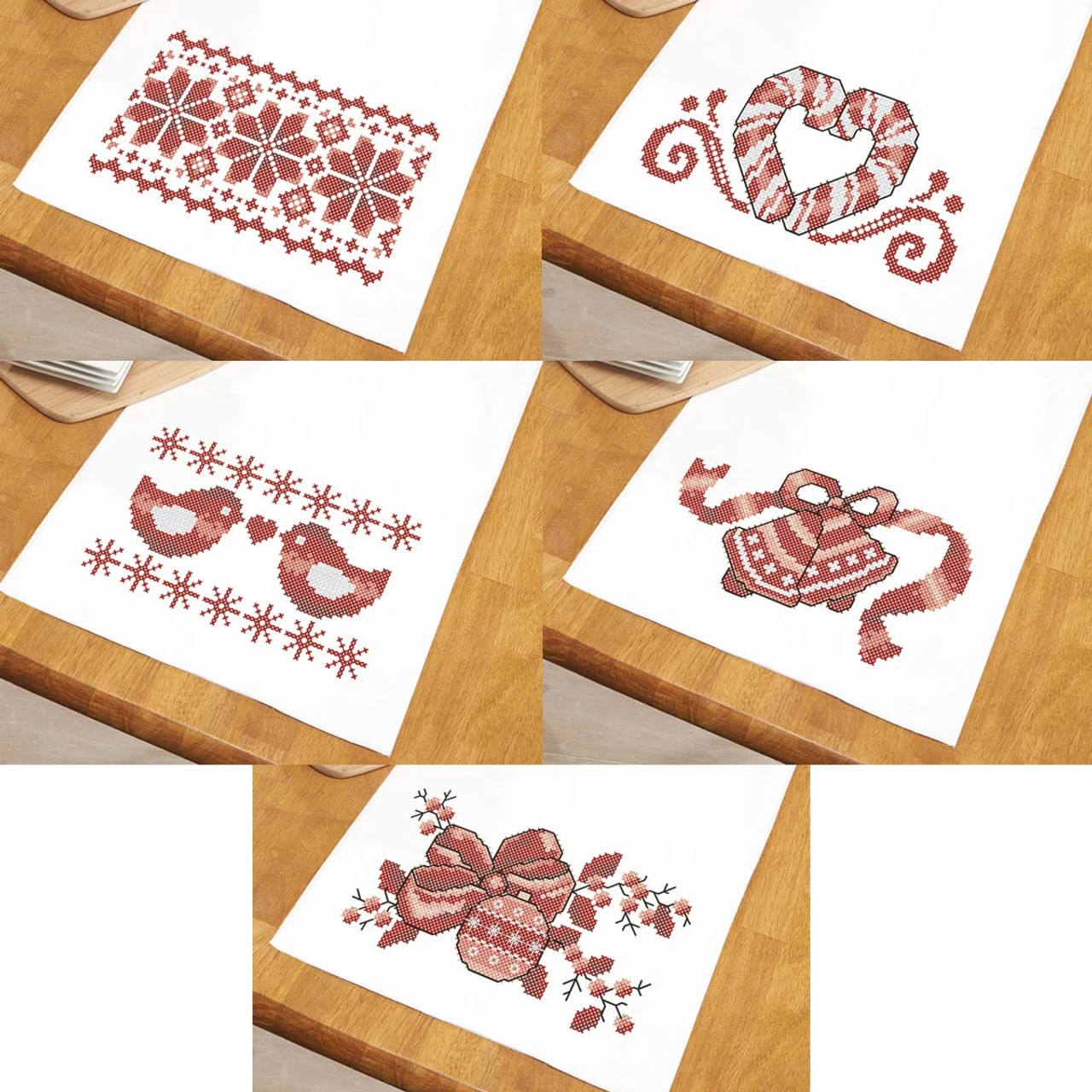 Make a statement with a collection of rich crimson designs. Stamped for cross-stitch on white polyester/cotton fabric with a perle edge. Set of five. 14 x 44″ (36 x 112cm). Made in U.S.A.