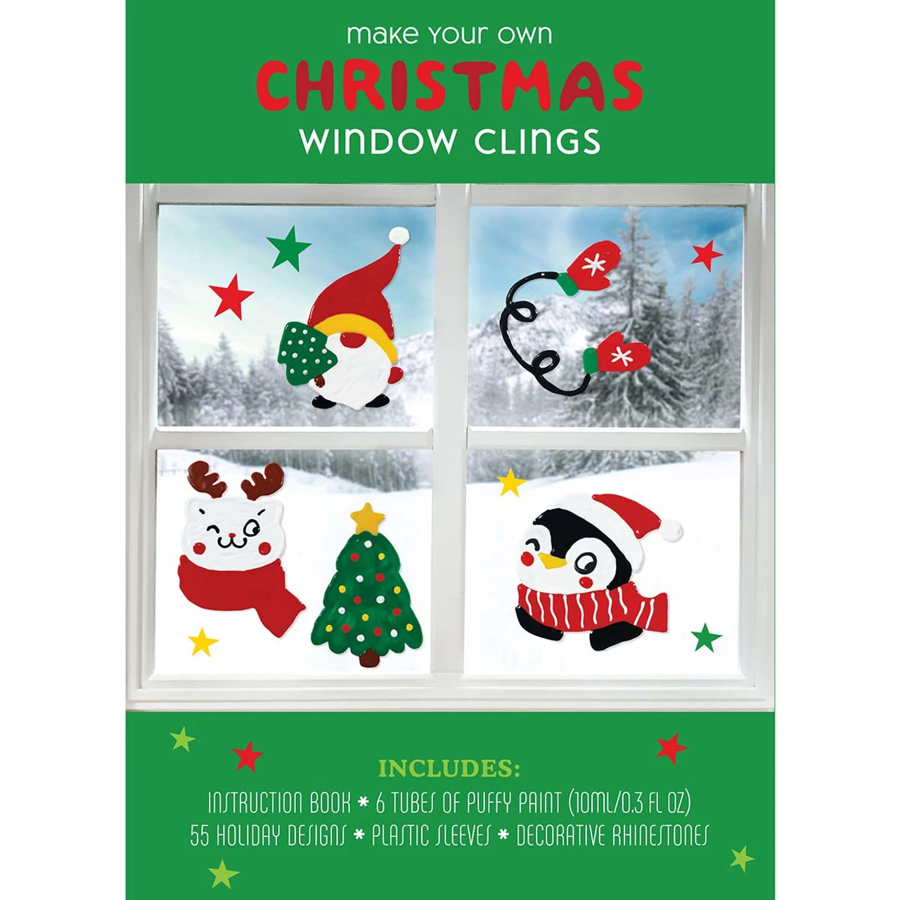 Create your own Christmas window clings! This fun and easy window cling kit makes a great family activity to create personalized holiday décor. The set includes plastic sleeves, 6 tubes of puffy paint, decorative rhinestones, and instruction book with 55 holiday designs to help you create your window clings. Or, you can come up with your own designs!