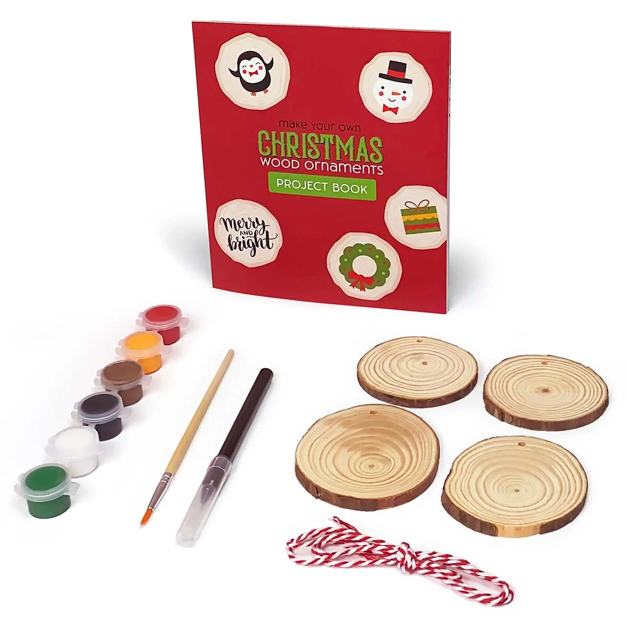 • The paint-your-own ornament kit includes wood slice ornaments, twine, paint, paintbrush, marker, and project book.