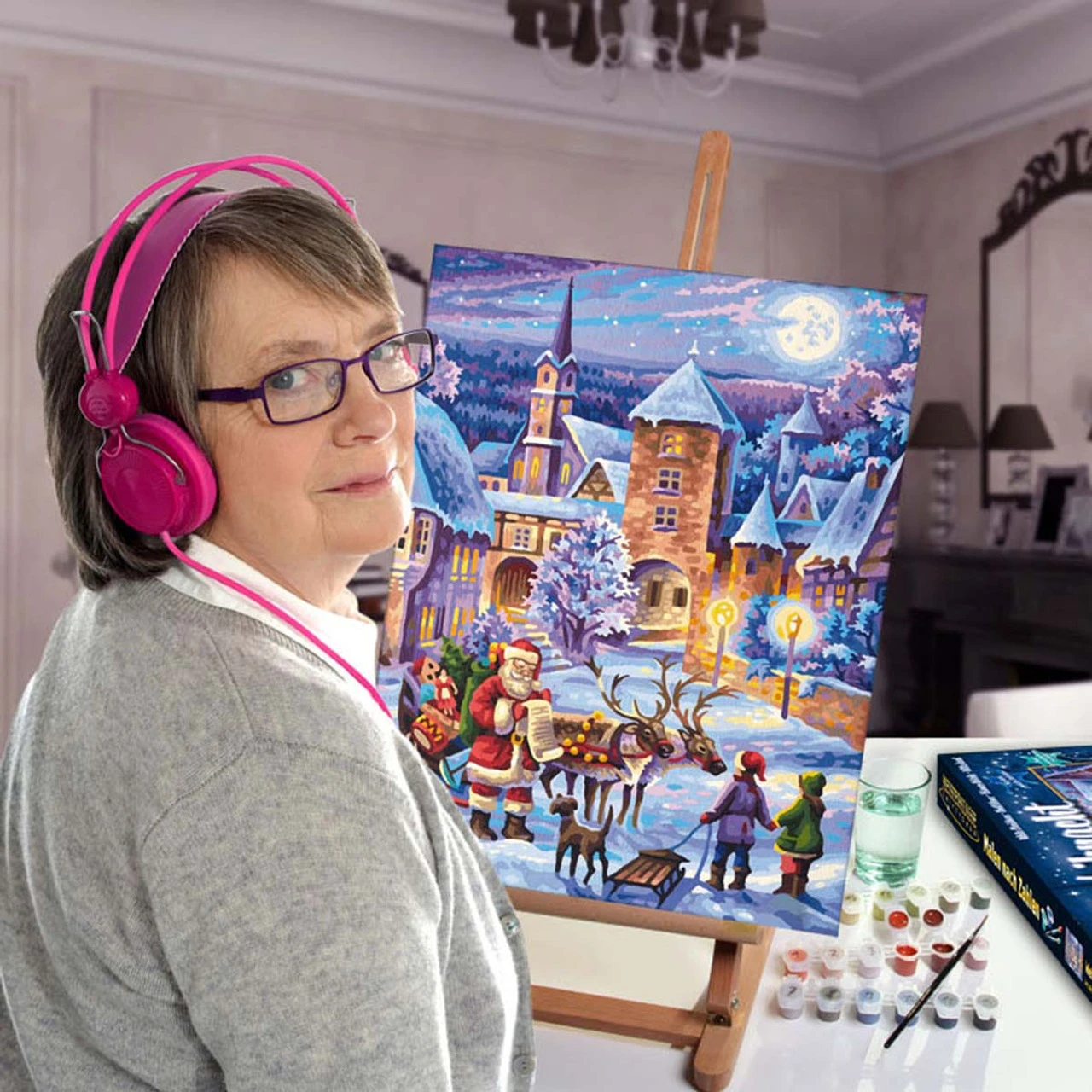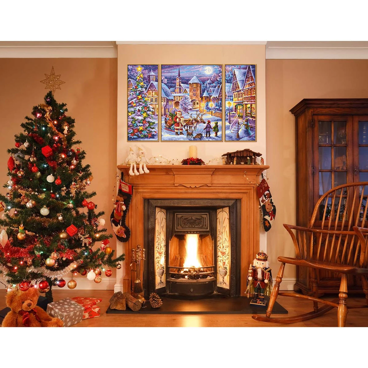 This Christmas paint-by-number scene shows Santa greeting some children as he checks his list in the town square of this quiet winter village. The triptych-style display uses three separate panels to create one panoramic scene showcasing the charming little shops, snowmen, and Christmas trees that bring holiday spirit to the finished image. This premium paint-by-number kit is created by a well-known German artist with high-quality pre-mixed artist’s paints. Kit includes pre-printed textured art board, pre-mixed acrylic paints, artist paintbrush, and easy instructions. Finished painting measures 32 x 20″ (80 x 50cm) when displayed together.